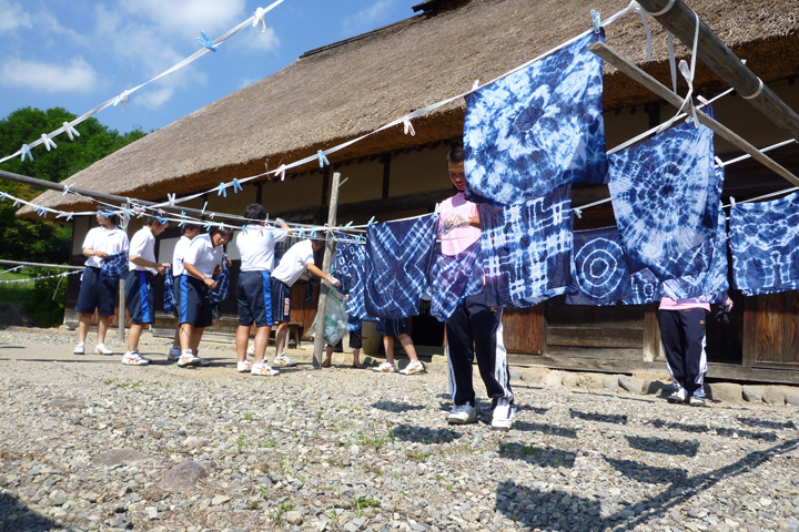 奥会津博物館では、茅葺き屋根の古民家「染屋」で藍染体験ができます。