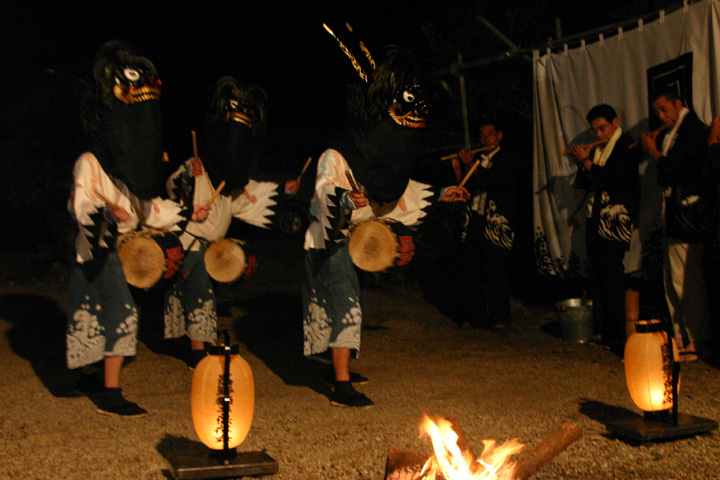 日光東照宮建立の際、地固めに招かれて舞を演じたと伝わっており、 芸術的な要素をもつ秘術「弓くぐりの舞」などがあります。 稲荷神社秋期例大祭の宵宮に舞われる3匹獅子舞で、腰に太鼓を付けた雌と雄2匹の獅子が舞います。 夜8時過ぎ、神社の拝殿で準備を整えた舞いの一行は、囃しながら隣の観音堂に参拝、そして神社の鳥居前で一頻り舞った後、境内の舞殿で一庭を舞います。